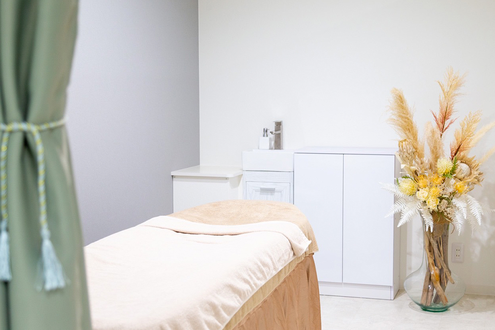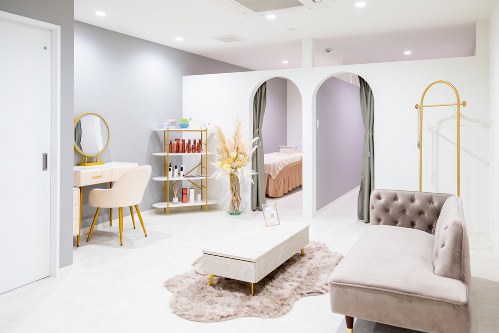 ライトグレーとゴールドを基調とした、エレガントなエステサロンの店舗です。 こちらの一押しポイントは、なんといってもR型の施術室入口!とても可愛く仕上がりました。 入口上は、エアコンが一台ですべての部屋に、行き届くように解放し、エコで節電できる仕様になりました。